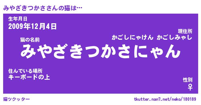 | 男性向けラノベタイトル風あだ名 | 『みやざきつかさの憂鬱』 |
