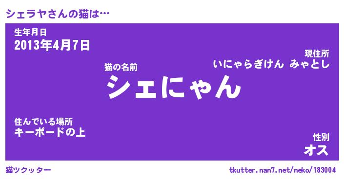 | 意味不明あだ名 | 『ペロリンシェラヤ』『永久保存シェラヤ』 |