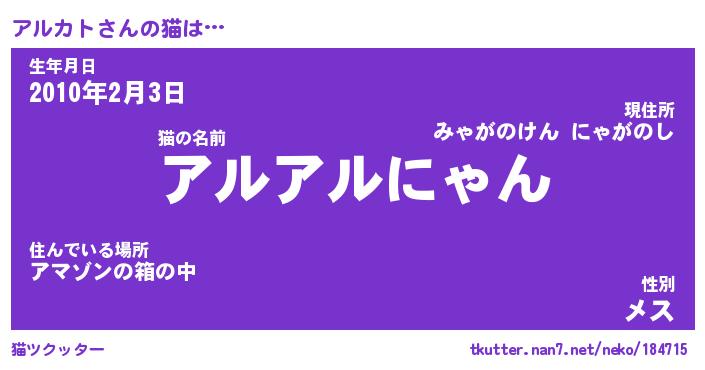 | 意味不明あだ名 | 『ペロリンアルカト』『永久保存アルカト』 |