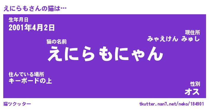 | 意味不明あだ名 | 『ペロリンえにらも』『永久保存えにらも』 |