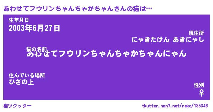 | 男性向けラノベタイトル風あだ名 | 『あわせてフウリンちゃんちゃかちゃんの憂鬱』 |
