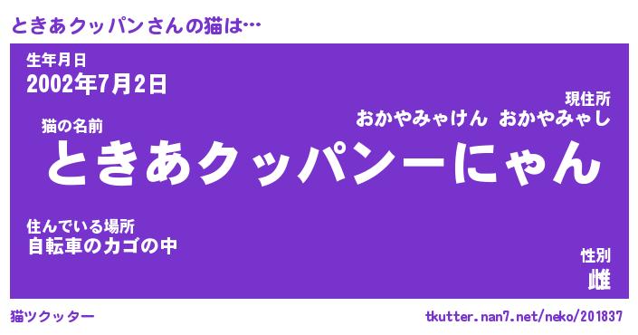 | ツイッター | ときあクッパンさんのツイッターID『namakemono_nyan』 |