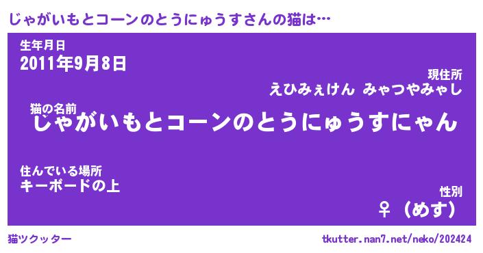 | ツイッター | じゃがいもとコーンのとうにゅうすさんのツイッターID『renkon_idle』 |