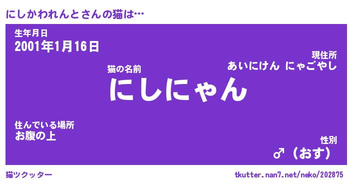 | ポケモン風あだ名 | 『ニシチュウ』『ニシカダネ』 |