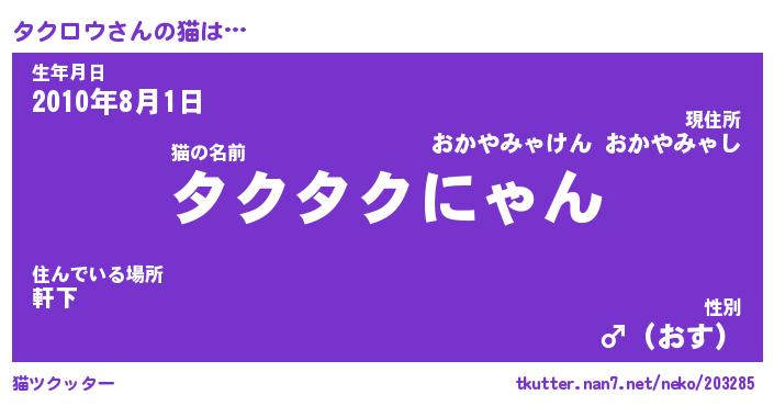 | 意味不明あだ名 | 『ペロリンタクロウ』『永久保存タクロウ』 |