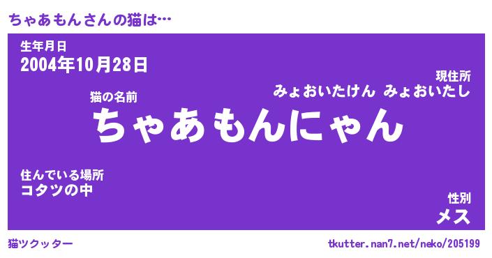 | 男性向けラノベタイトル風あだ名 | 『ちゃあもんの憂鬱』 |