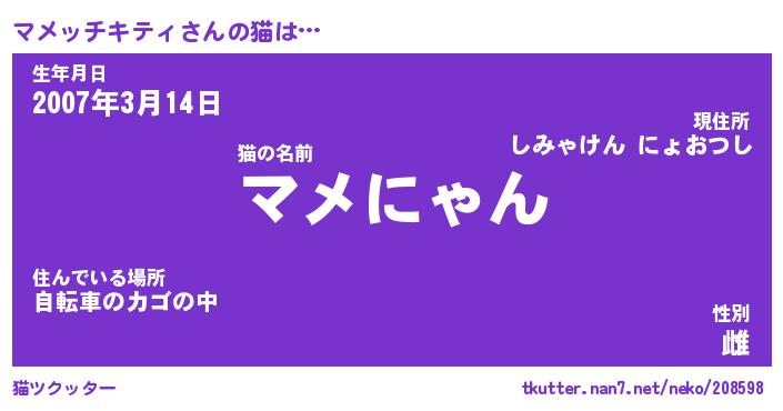 | 男性向けラノベタイトル風あだ名 | 『マメッチキティの憂鬱』 |