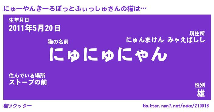| ツイッター | にゅーやんきーろぼっとふぃっしゅさんのツイッターID『dendenmushi_nyan』 |