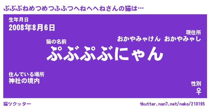 | 料理風あだ名 | 『節約★ぷぶぷねめつめつふふつへねへへねと油揚げの玉子丼』 |