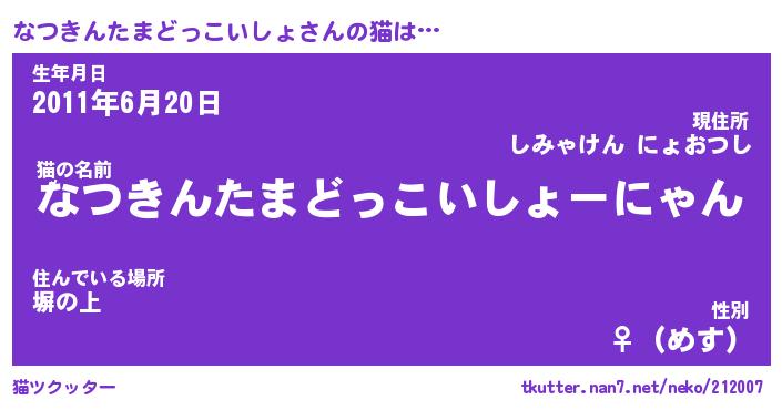 | ツイッター | なつきんたまどっこいしょさんのツイッターID『fukuyoka_nyan』 |