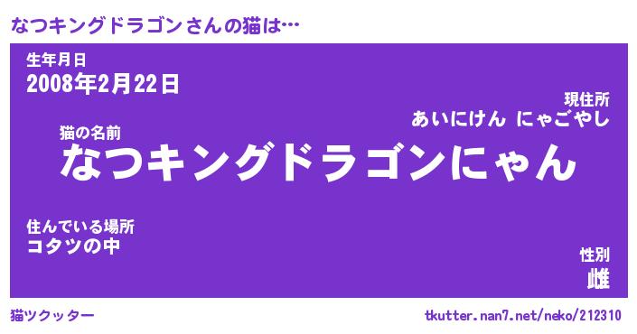 | 男性向けラノベタイトル風あだ名 | 『なつキングドラゴンの憂鬱』 |