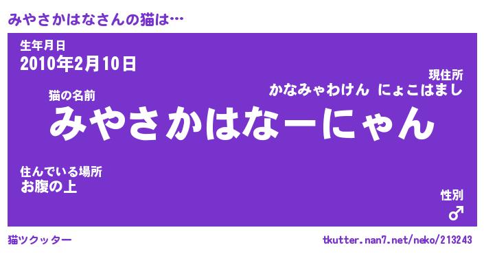 | ヒーロー風カッコイイあだ名 | 『スーパーミヤサカハナ』『炎刃騎士ミヤ』 |