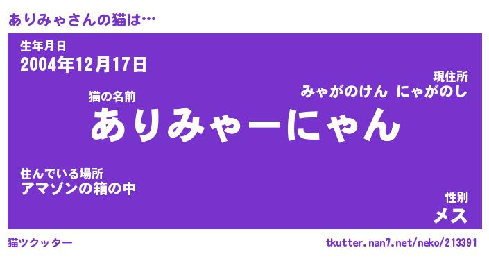 | 意味不明あだ名 | 『ペロリンありみゃ』『永久保存ありみゃ』 |