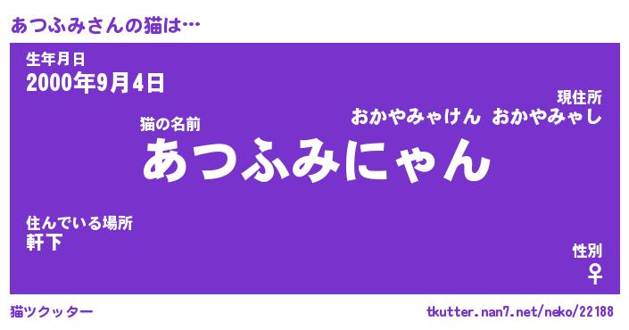 | 男性向けラノベタイトル風あだ名 | 『あつふみの憂鬱』 |