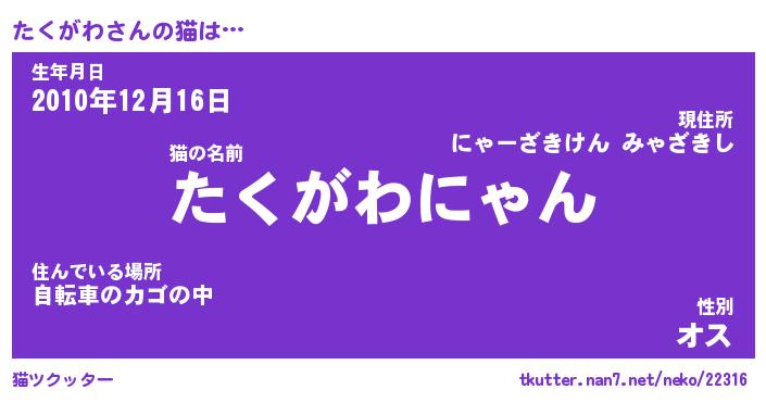 | 意味不明あだ名 | 『ペロリンたくがわ』『永久保存たくがわ』 |