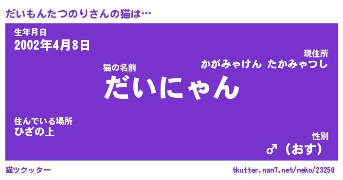 | 男性向けラノベタイトル風あだ名 | 『だいもんたつのりの憂鬱』 |