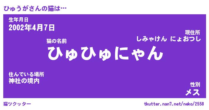 | ポケモン風あだ名 | 『ヒュチュウ』『ヒュウダネ』 |