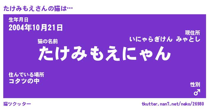| ファンタジー風あだ名 | 『タケフェル』『エターナルタケミモエー』 |