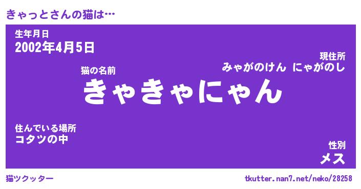 | 意味不明あだ名 | 『ペロリンきゃっと』『永久保存きゃっと』 |