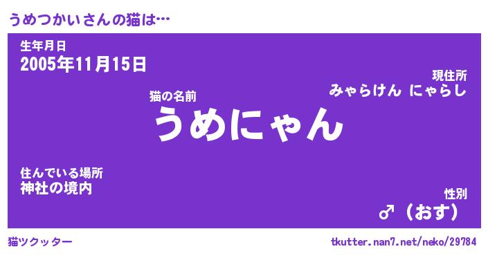 | 男性向けラノベタイトル風あだ名 | 『うめつかいの憂鬱』 |