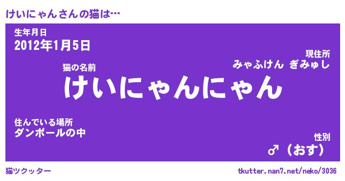 | 男性向けラノベタイトル風あだ名 | 『けいにゃんの憂鬱』 |