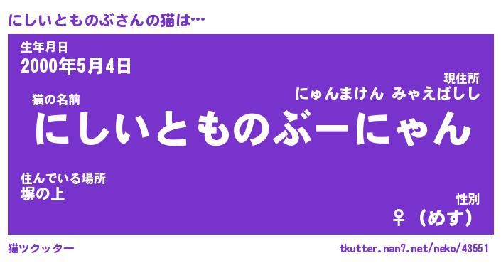 | ツイッター | にしいとものぶさんのツイッターID『namakemono_nyan』 |