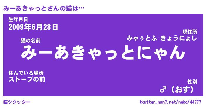| 男性向けラノベタイトル風あだ名 | 『みーあきゃっとの憂鬱』 |