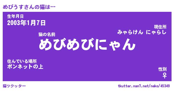 | ヘコむあだ名 | 『めびにー』『牛乳』『めびぷりん』 |