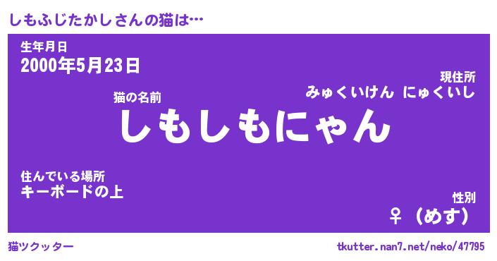 | ツイッター | しもふじたかしさんのツイッターID『namakemono_nyan』 |