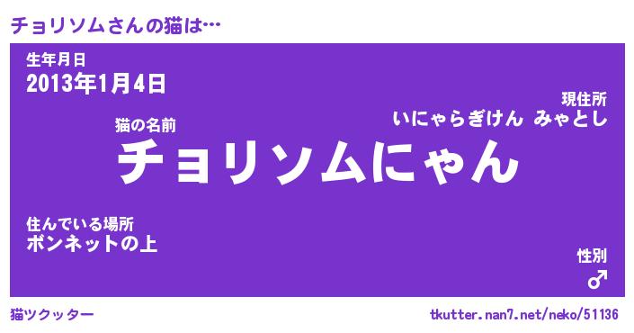 | 男性向けラノベタイトル風あだ名 | 『チョリソムの憂鬱』 |