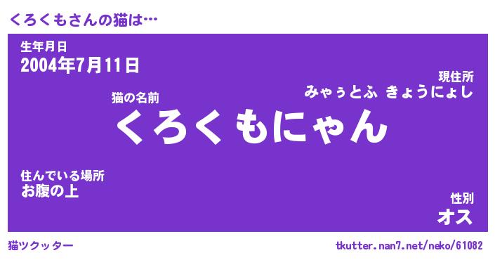 | 意味不明あだ名 | 『ペロリンくろくも』『永久保存くろくも』 |