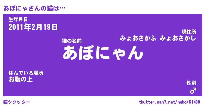 | 意味不明あだ名 | 『ペロリンあぼにゃ』『永久保存あぼにゃ』 |
