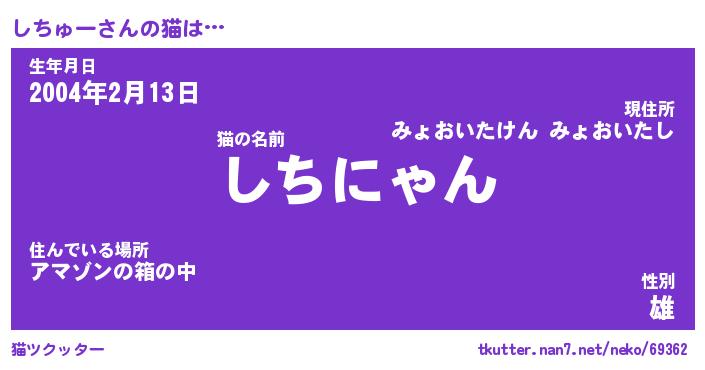 | 男性向けラノベタイトル風あだ名 | 『しちゅーの憂鬱』 |