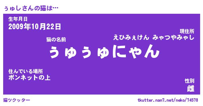 | ポケモン風あだ名 | 『ゥュチュウ』『ゥュシダネ』 |