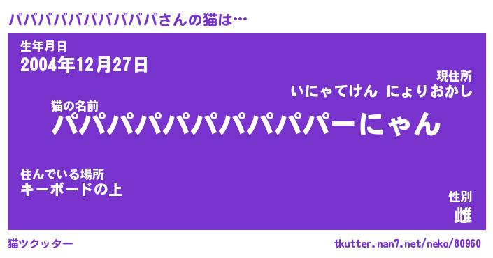 | 男性向けラノベタイトル風あだ名 | 『パパパパパパパパパパアートオンライン』 |