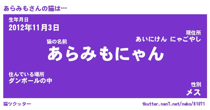 | 意味不明あだ名 | 『ペロリンあらみも』『永久保存あらみも』 |