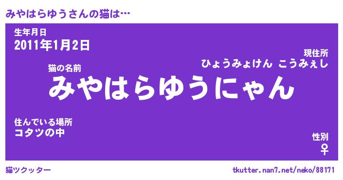 | 女子向けラノベタイトル風あだ名 | 『(仮)みやはらゆうのやんごとなき事情』 |