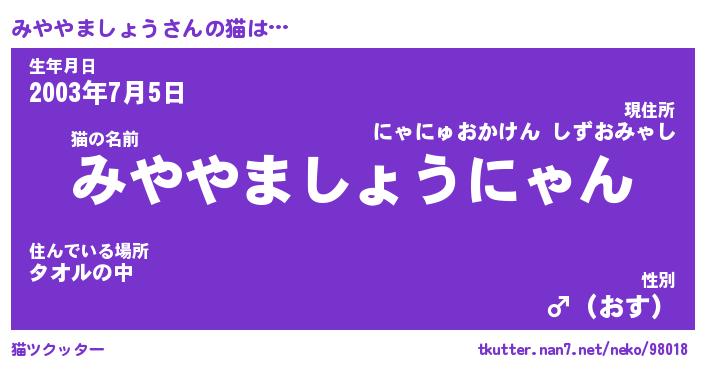 | 男性向けラノベタイトル風あだ名 | 『みややましょうの憂鬱』 |