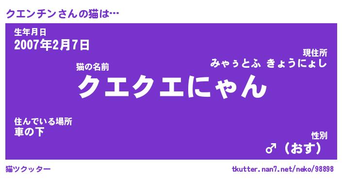 | ポケモン風あだ名 | 『クエチュウ』『クエンダネ』 |