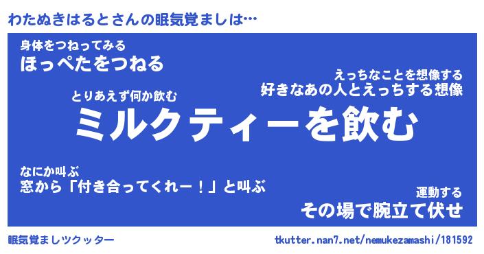 | 男性向けラノベタイトル風あだ名 | 『わたぬきはるとの憂鬱』 |