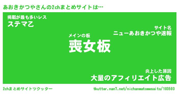 あおきかつやさんの2chまとめサイトは… メインの板『喪女板』掲載が最も多いレス『ステマ乙』炎上した原因『大量のアフィリエイト広告』 ツクッター #2chまとめサイトツクッター http://tkutter.nan7.net/nichanmatomesaito/103503/