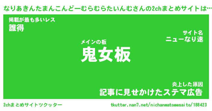 なりあきんたまんこんどーむらむらたいんむさんの2chまとめサイトは… メインの板『鬼女板』掲載が最も多いレス『誰得』炎上した原因『記事に見せかけたステマ広告』 ツクッター #2chまとめサイトツクッター http://tkutter.nan7.net/nichanmatomesaito/188423/