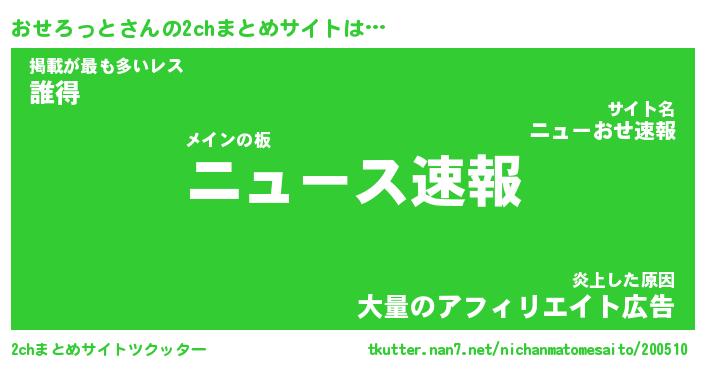 おせろっとさんの2chまとめサイトは… メインの板『ニュース速報』掲載が最も多いレス『誰得』炎上した原因『大量のアフィリエイト広告』 ツクッター #2chまとめサイトツクッター http://tkutter.nan7.net/nichanmatomesaito/200510/
