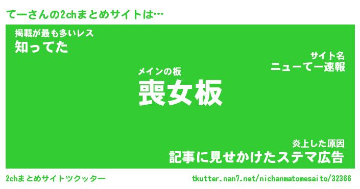 てーさんの2chまとめサイトは… メインの板『喪女板』掲載が最も多いレス『知ってた』炎上した原因『記事に見せかけたステマ広告』 ツクッター #2chまとめサイトツクッター http://tkutter.nan7.net/nichanmatomesaito/32366/