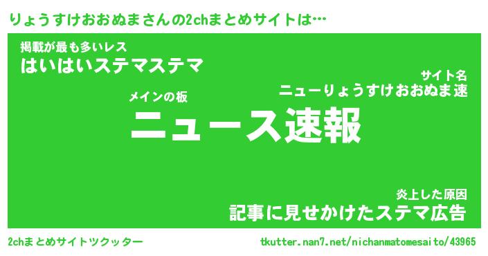 りょうすけおおぬまさんの2chまとめサイトは… メインの板『ニュース速報』掲載が最も多いレス『はいはいステマステマ』炎上した原因『記事に見せかけたステマ広告』 ツクッター #2chまとめサイトツクッター http://tkutter.nan7.net/nichanmatomesaito/43965/