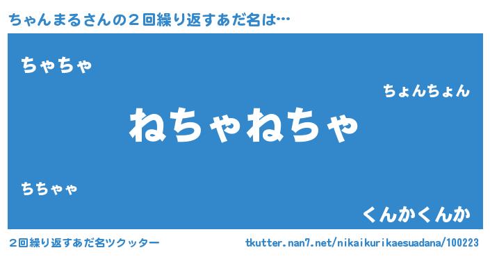 | 男性向けラノベタイトル風あだ名 | 『ちゃんまるの嫁は女の子じゃないと思った?』 |
