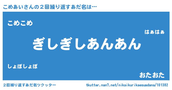 | 意味不明あだ名 | 『永久保存こめあい』『ペロリンこめあい』 |