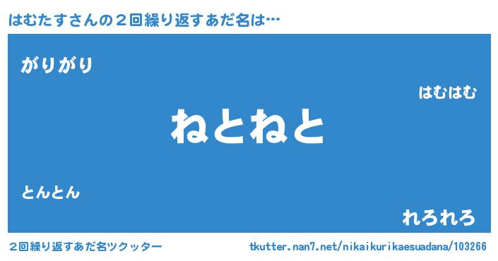 | 男性向けラノベタイトル風あだ名 | 『はむたすの嫁は女の子じゃないと思った?』 |