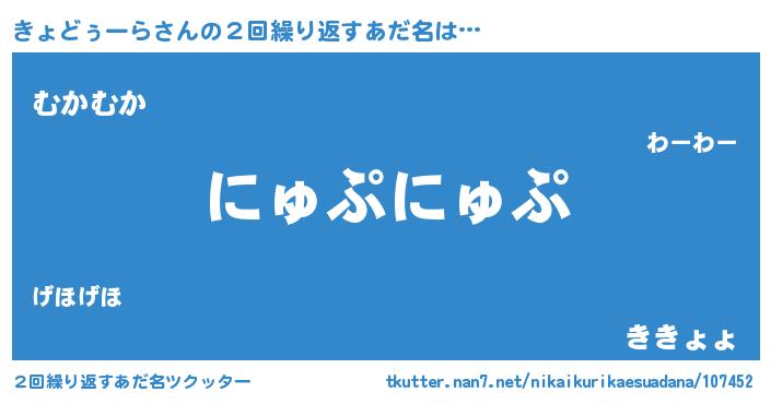 | 男性向けラノベタイトル風あだ名 | 『きょどぅーらの嫁は女の子じゃないと思った?』 |