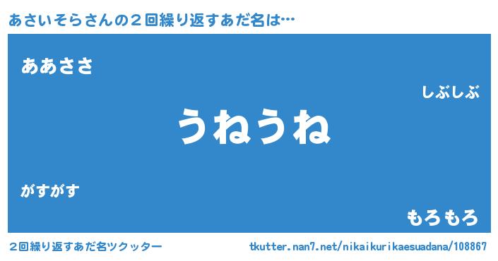 | ポケモン風あだ名 | 『ヒアサイソラ』『アサイダネ』 |